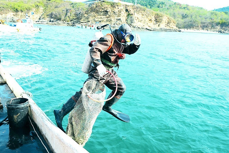 冬捕节当天,20余名潜水员庄严宣誓:“感恩生态,限量采捕”,铿锵誓言彰显了獐子岛人对海洋的敬畏与感恩。伴随着悠扬的冬捕节主题曲《采参谣》,现场气球冉冉升起、彩烟飞扬、采捕船齐声鸣笛,全副武装的潜水员们分乘捕捞船劈波斩浪,奔赴獐子岛马牙滩海域——这一闻名遐迩的纯种野生源刺参原生态栖息地。